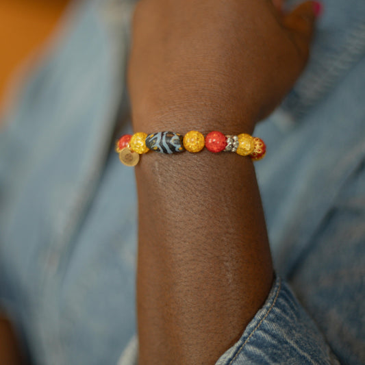 This stunning bracelet features a colorful assortment of beads, combining vibrant reds, yellows, and blues with intricate designs. The perfect accessory for adding a cheerful touch to any outfit, this bracelet is both stylish and versatile, making it ideal for everyday wear or special occasions.